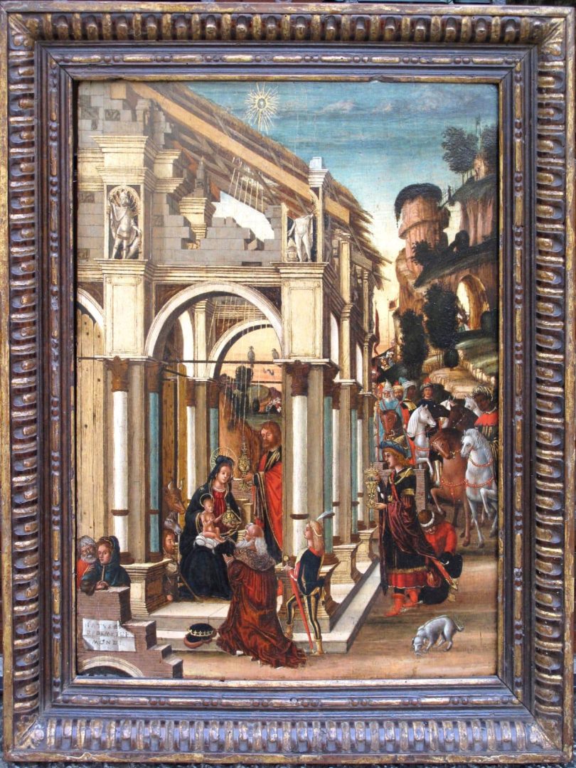 Domenico Morrone, adorazione dei Magi, tavola centimetri 61 × 45,5. In questa tavola di medie misure si snoda il corteo dei Magi che si avvia verso l’edificio diruto, entro il quale si presenta la sacra famiglia a ricevere i loro doni. Tutti gli elementi che arricchiscono la pittura del Veronese Domenico Morrone vi sono presenti e confermano le doti di fantasia ereditate dal mondo tardogotico e l’intelligenza dell’accogliere le novità rinascimentali che contraddistinsero la sua opera. Allievo di Francesco Benaglio, il Morrone si presenta già in fase evoluta nella “Madonna col bambino” del 1483 e lo vediamo in seguito aggiornarsi a Padova nell’ambiente mantegnesca e a Venezia in direzione del carpaccio.